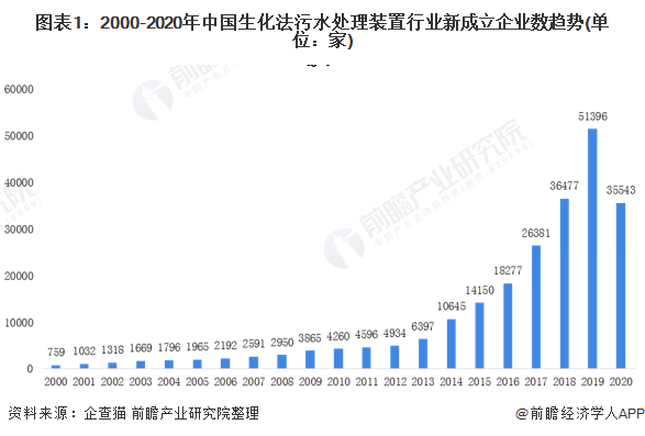 根據(jù)企查貓的數(shù)據(jù)顯示,2000-2020國(guó)生化法污水處理裝置行業(yè)新成立企業(yè)數(shù)呈現(xiàn)逐年上升趨勢(shì)。自2014年起,中國(guó)生化法污水處理裝置行業(yè)新成立企業(yè)數(shù)呈現(xiàn)爆發(fā)狀態(tài),在2019到了近年了峰值51396家,較2013年的6397家翻了將近5倍。截止到2020年12月初,中國(guó)生化法污水處理裝置行業(yè)新成立企業(yè)數(shù)為35543家,已經(jīng)逼近2018年全年的數(shù)據(jù)。