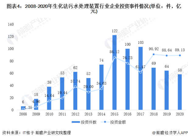 根據(jù)it桔子的數(shù)據(jù)顯示,2008-2020年生化法污水處理裝置行業(yè)企業(yè)投資事件呈現(xiàn)波動(dòng)趨勢(shì)。在2015年,生化法污水處理裝置行業(yè)企業(yè)投資事件達(dá)到近年來(lái)峰值122件,但投資金額為86.12億元。從投資金額角度來(lái)看,在2018年,生化法污水處理裝置行業(yè)企業(yè)投資達(dá)到了近年來(lái)峰值90.92億元。