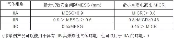 ii類隔爆型電氣設(shè)備或本質(zhì)安全型電氣設(shè)備,按其適用于爆炸性氣體混合物的最大試驗(yàn)安全間隙或最小點(diǎn)燃電流比,進(jìn)一步分為iia、iib和iic類。如下表所示。