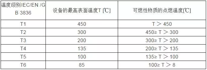 這是與氣體點(diǎn)燃溫度有關(guān)的電氣設(shè)備(假定環(huán)境溫度為40℃時(shí))的最高表面溫度,點(diǎn)燃能量與點(diǎn)燃溫度無關(guān)。