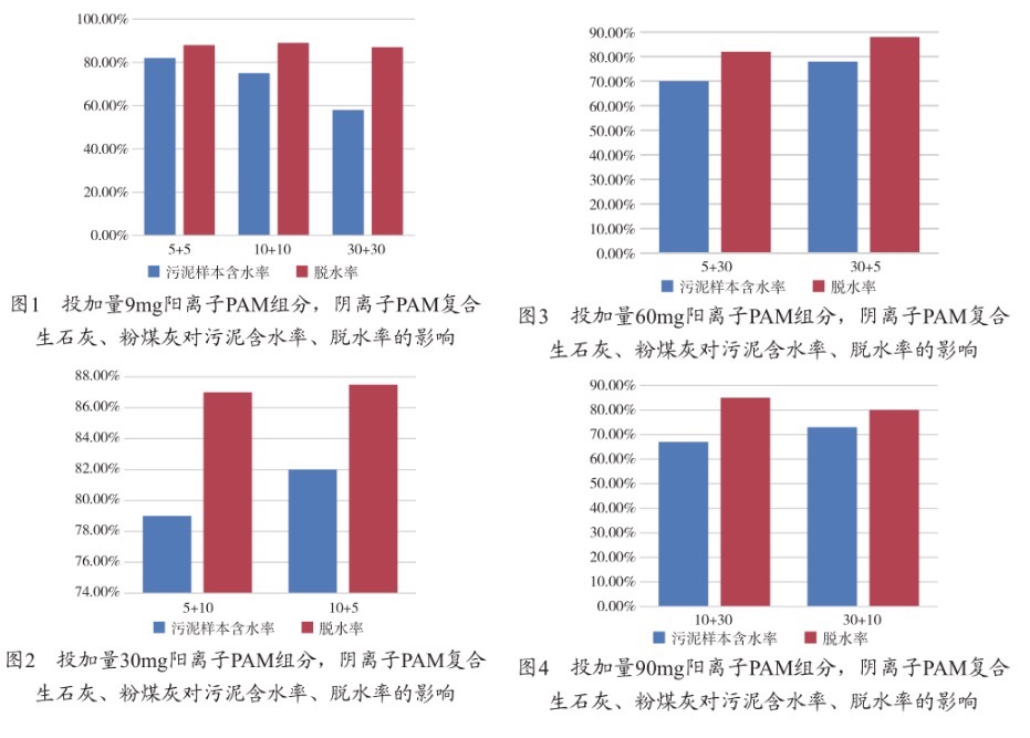 如圖1、圖2、圖3、圖4所示,分別為投加量為9mg、30mg、60mg、90mg的陽離子pam組分,陽離子pam 復合生石灰、粉煤灰對污泥含水率、脫水率的影響。